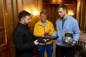 Президент Володимир Зеленський зустрівся з українським скелетоністом, членом національної олімпійської збірної команди України Владиславом Гераскевичем і його батьком, тренером збірної