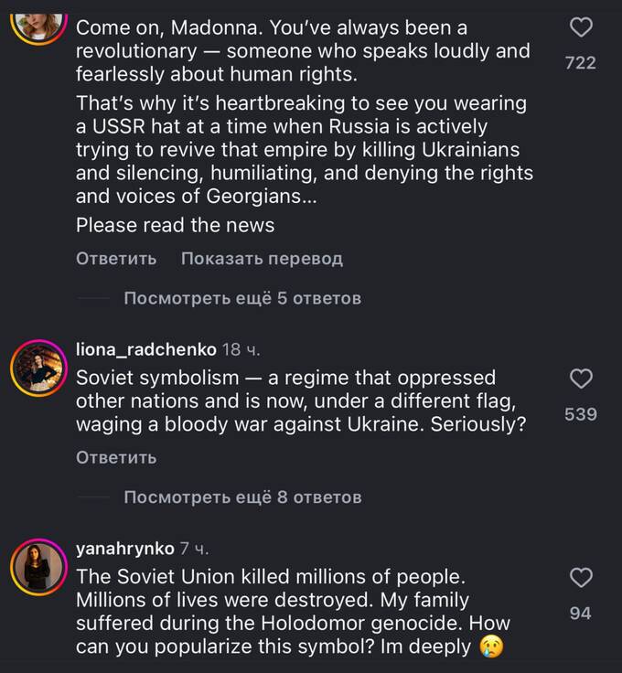 Мадонна розмістила в соціальних мережах фото в шапці-вушанці з радянською кокардою, що спричинило хвилю негативних коментарів від українських користувачів.