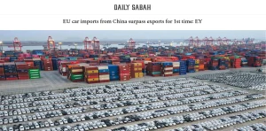 Вперше в історії імпорт автомобілів та комплектуючих з КНР до Євросоюзу перевищив експорт у зворотному напрямку. У 2022 році експорт автопродукції з ЄС до Китаю знизився на 34%, досягнувши 16 млрд євро, тоді як імпорт китайських автомобілів та запчастин виріс на 8% — до 22 млрд євро.