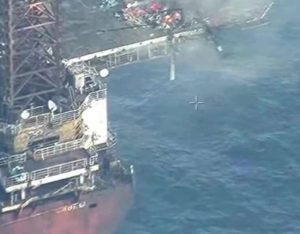 На оприлюдненому ВМСУ відео спочатку демонструється ураження опор бурової установки “Сиваш” у Чорному морі морським дроном-камікадзе. Російські війська використовували цю платформу для розміщення комплексів радіоелектронної боротьби, протиповітряної оборони та засобів зв’язку.