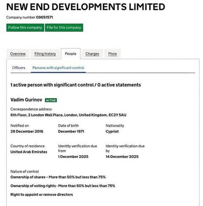 Зокрема, йдеться про британську компанію NEW END DEVELOPMENTS LIMITED у сфері нерухомості, яку контролює Вадим Гурінов, а частка в ній оформлена на його доньку Валерію.
