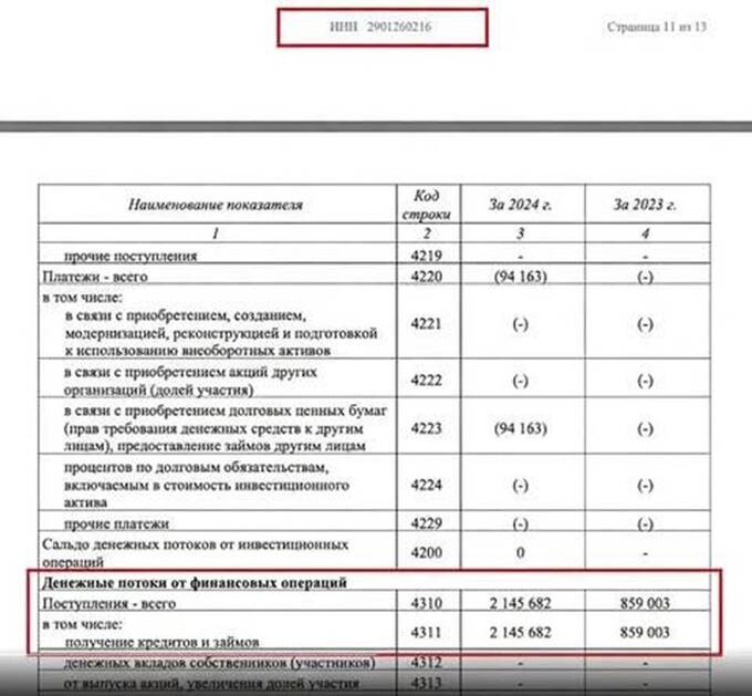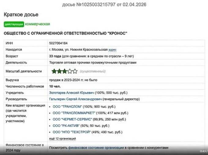 Втім, фінансова активність компанії виглядає аномальною. У 2024 році фірма зі статутним капіталом у 10 тис. рублів отримала кредит на понад 2 млрд рублів, при цьому протягом того ж року повернула близько 1,8 млрд рублів. Крім того, компанія видала третім особам короткострокову позику на майже 95 млн рублів, яка швидко була повернута.