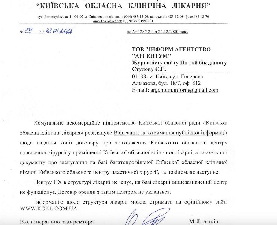 Відповідь підписав в.о. генерального директора лікарні Микола Анікін. Це сталося після кількох невдалих спроб журналістів отримати від нього коментар. Інформаційний запит загнав функціонера в кут — Анікін вирішив, що краще надати правдиві дані, ніж зіткнутися з кримінальними статтями 364 (зловживання владою або службовим становищем) і 366 (службова підробка).