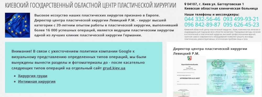 “Директор центру пластичної хірургії Левицький Р. М. — хірург вищої категорії з 20-річним стажем у пластичній хірургії, який виконав понад 16 000 успішних операцій, вважається провідним пластичним хірургом однієї з найкращих клінік Німеччини”.