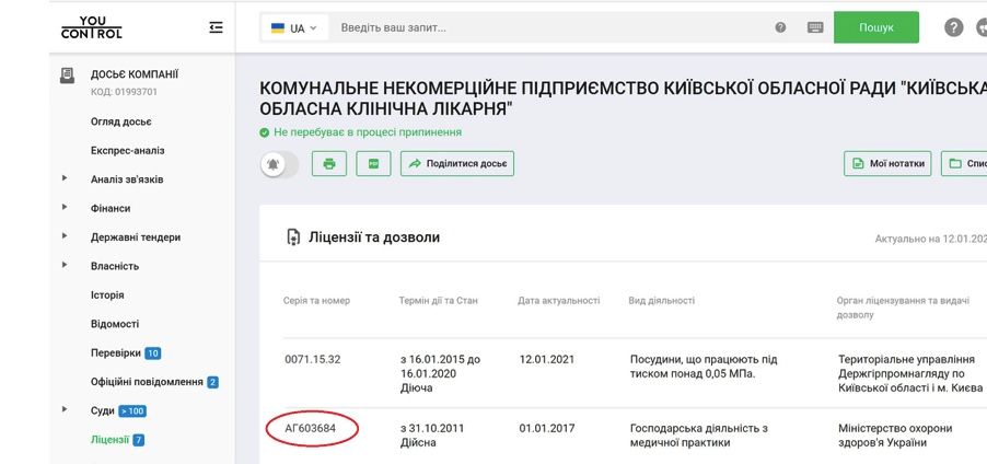 Журналісти також перевірили номер ліцензії МОЗ, зазначений на сайті фіктивного центру пластичної хірургії — серія АГ № 603684.