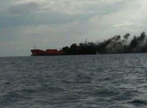 На відео видно, як судно повністю охоплене вогнем, а над водою підіймається стовп густого чорного диму.в Перській затоці, неподалік від Ормузької протоки.