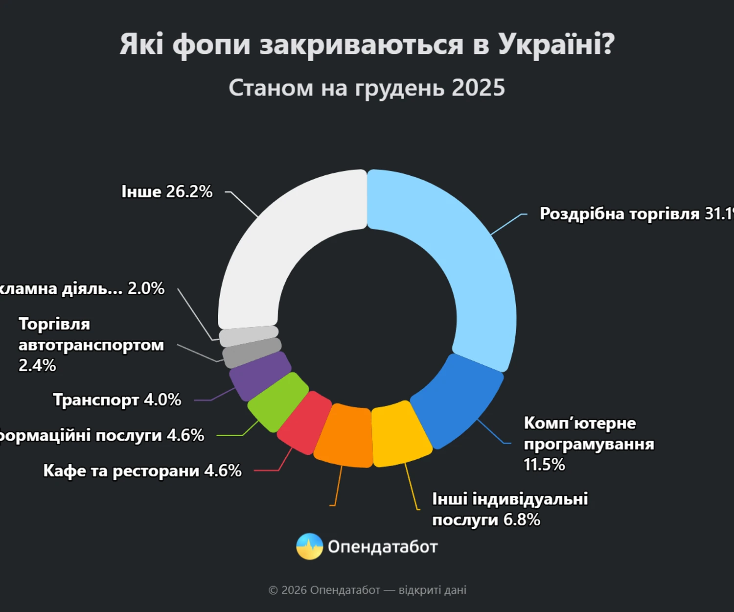 В Україні за 11 місяців 2025 року закрилось понад 250 тисяч фізичних осіб-підприємців (ФОПів). В середньому, ФОПи живуть 2,4 року Opendatabot.
