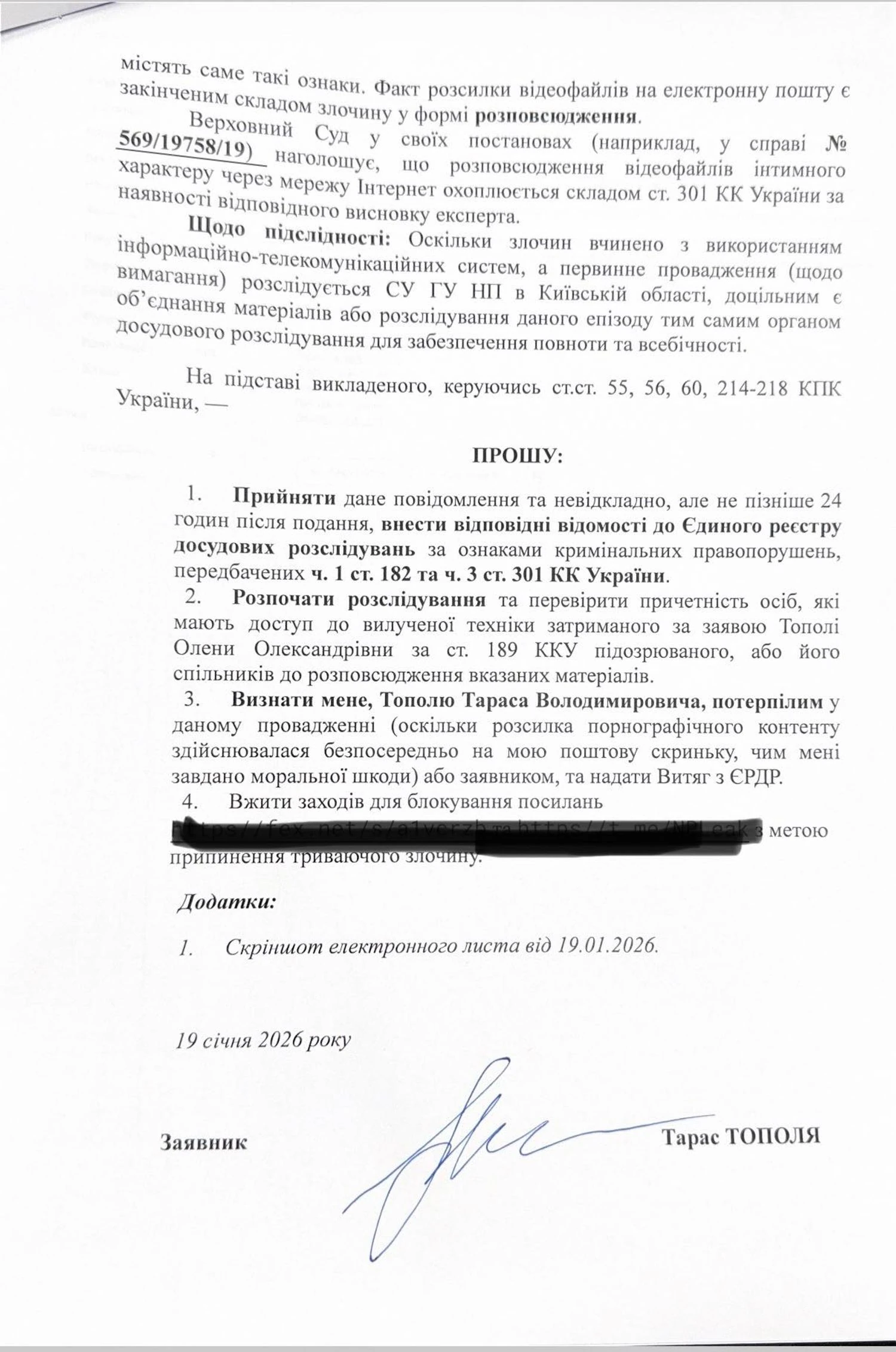 Як зазначив Тополя, ніхто не мав права вчиняти протиправні дії подібного характеру, стежити, знімати, шантажувати, намагаючись отримати вигоду чи заробити на цьому і намагатися зробити нестерпним життя його спільних з Оленою дітей.