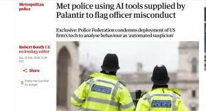 Служба поліції Лондона оголосила про впровадження технологій штучного інтелекту американської компанії «Palantir» для відстеження поведінки свого персоналу. Як повідомляє видання «The Guardian», за допомогою складних алгоритмів керівництво намагається виявити недоброчесних співробітників та запобігти посадовим злочинам.