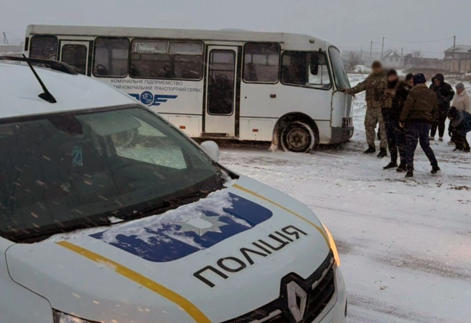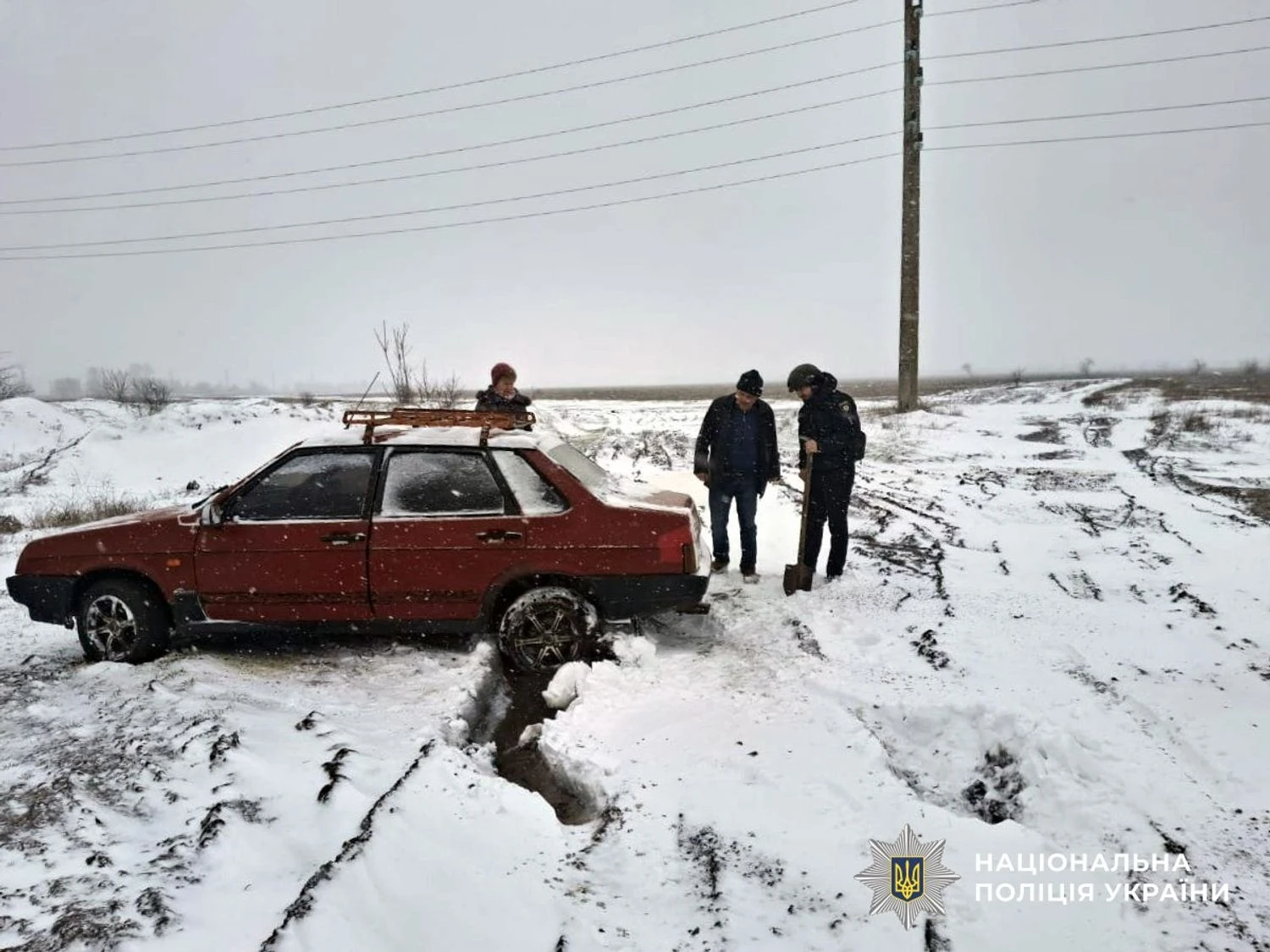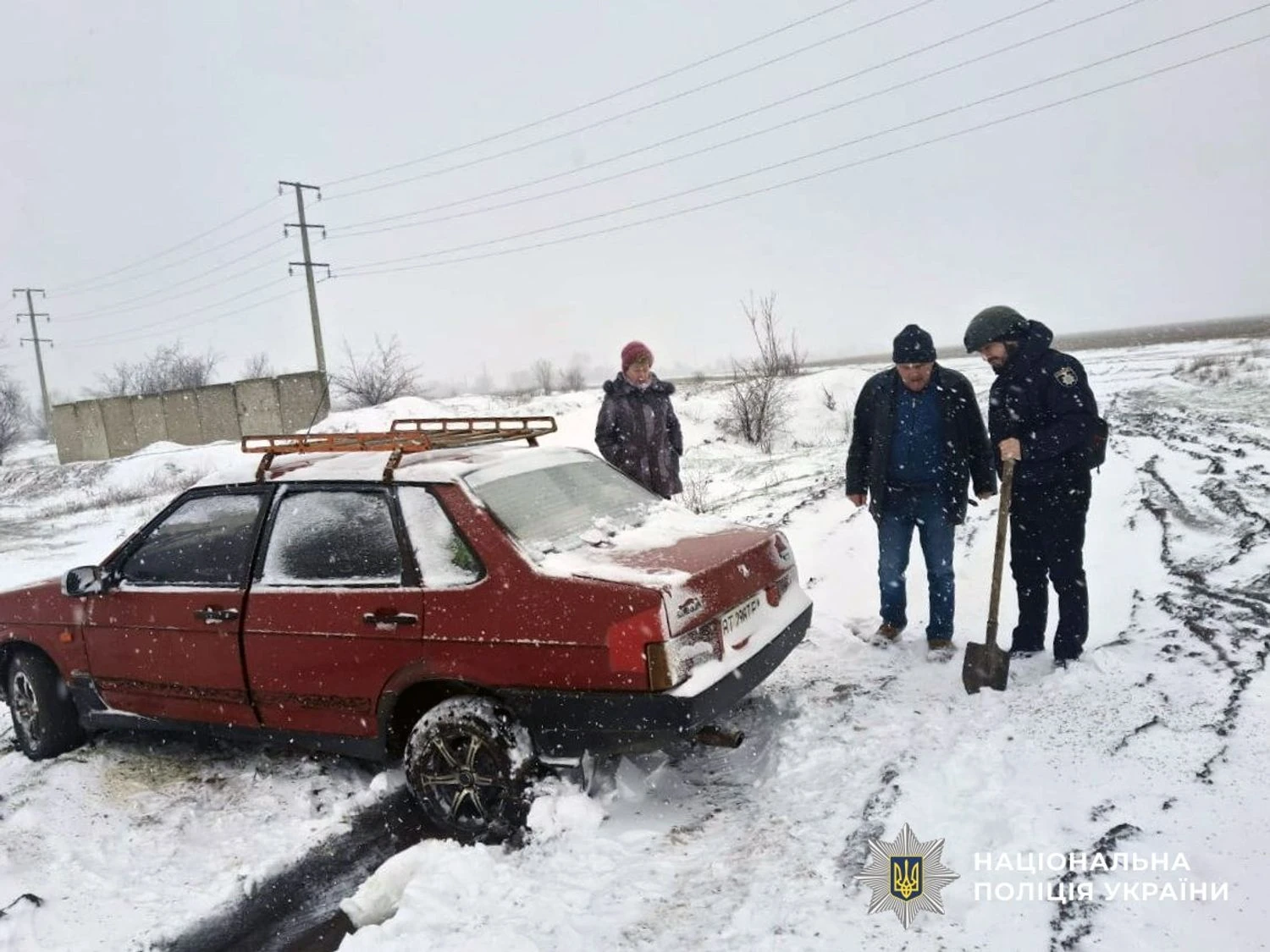 Водночас окремі транспортні засоби потрапили у снігові замети. Зокрема, працівники сектору реагування патрульної поліції Херсонського районного управління поліції зранку надали допомогу водіям автобуса та легкового автомобіля.