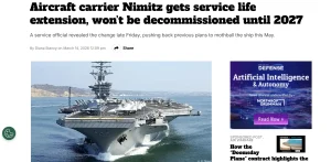 Військово-морські сили США ухвалили рішення про відтермінування виходу на пенсію найстарішого діючого авіаносця «Німіц» (USS Nimitz). Як повідомляє Breaking Defense, термін експлуатації корабля офіційно подовжено до березня 2027 року.