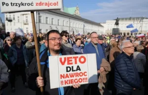 Глава держави заблокував виділення 43,7 мільярда євро, спрямованих на зміцнення колективної безпеки. Учасники мітингу, що зібралися під Президентським палацом, звинуватили Навроцького у зрадництві та вказали на загрози для національної безпеки, тримаючи плакати із закликами.