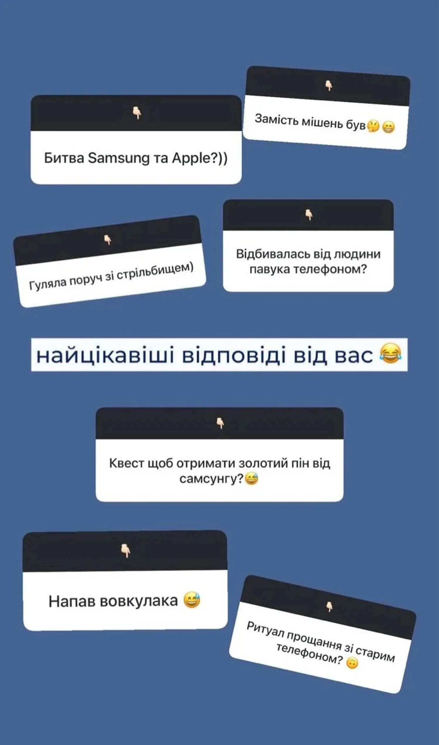 “Напав вовкулака”, Відбилась телефоном від Людини-Павука?”, “Був замість мішені”, “Ритуал прощання зі старим телефоном?”