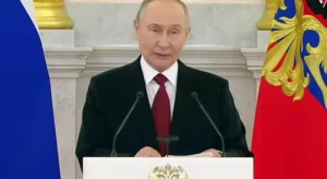Путін зазначив, що Україна нібито розглядає використання “ядерного компонента”. “Противник не гребує жодними засобами: вже дійшла інформація про його намір використовувати навіть якісь ядерні елементи. Зрозуміло, чим це може закінчитися,” — заявив він.